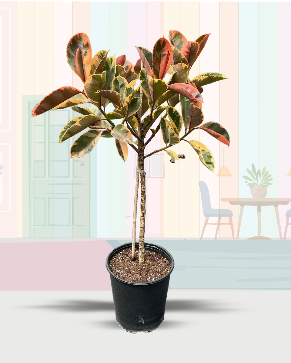 A more colorful Ficus, this plant has beautiful variegation in cream, pink and red on green leaves.